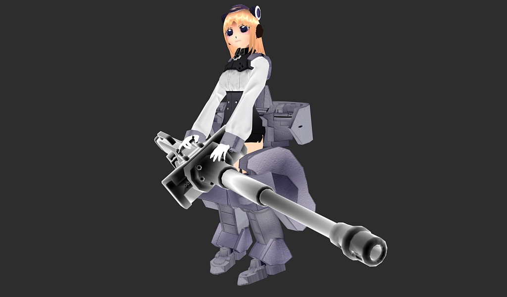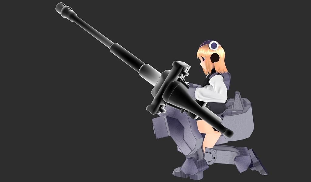 I actually used the cannon you modeled for the Tiger-I Girl model as a reference. There’s now a vertical side grip bar for support and the trigger handle is now held palm-facing down. (You can’t see the trigger from the angle it’s drawn–it’s basically a thumb-based one that’s hidden behind the square armor panel covering the side of the hand where the thumb is usually exposed.)