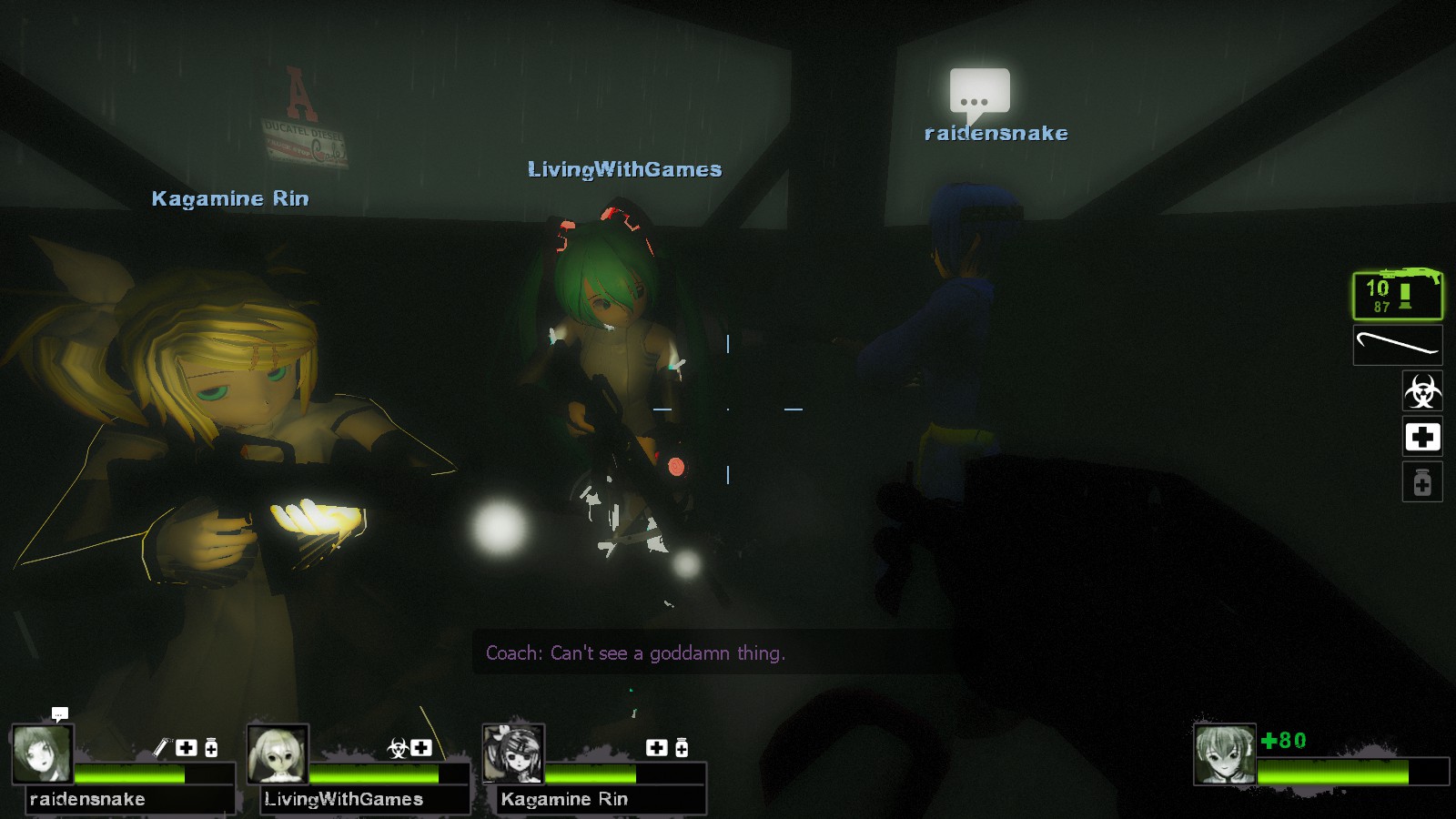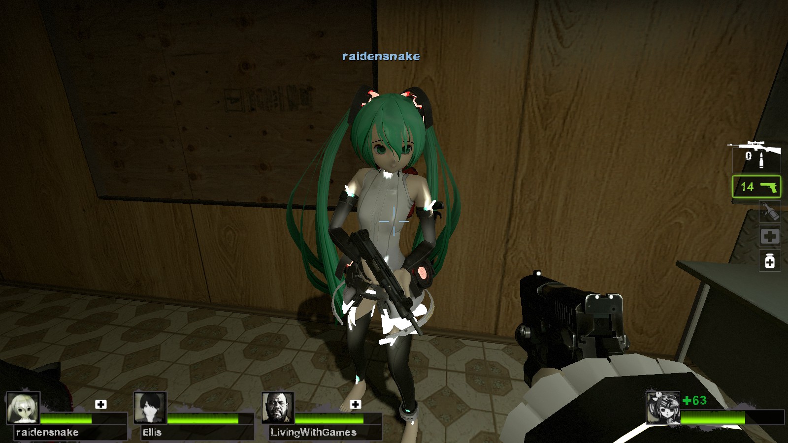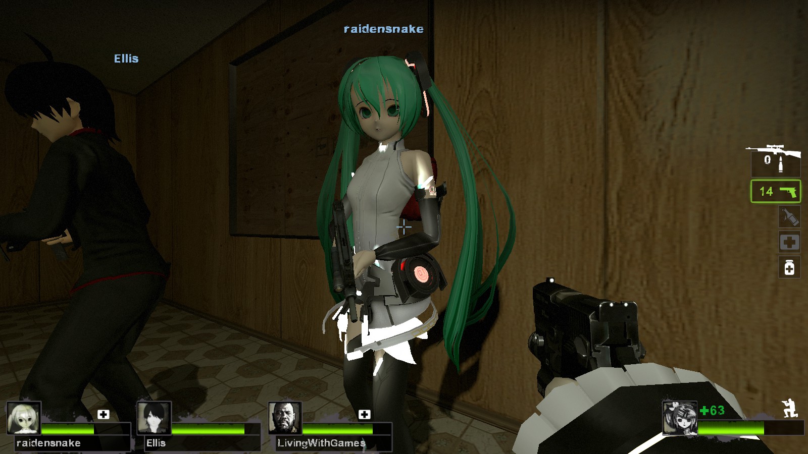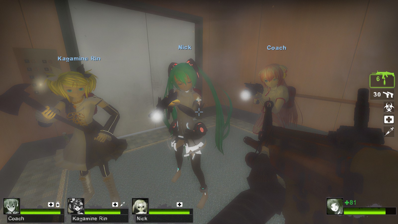 It’s replacing all survivors model specially for l4d2 cast (Rochelle, Nick, Ellis and Coach). So where is Vocaloids 4 Dead 1? well its not ready yet and it will replacing main l4d1 cast (Zoey, Francis, Louis and Bill) sooner or later. Of-course its for Left 4 Dead 2 game! No one ever play l4d1 game anymore and most all the character from l4d1 and the game also brought to l4d2. So Grab the Vocaloids 4 Dead 2 now!